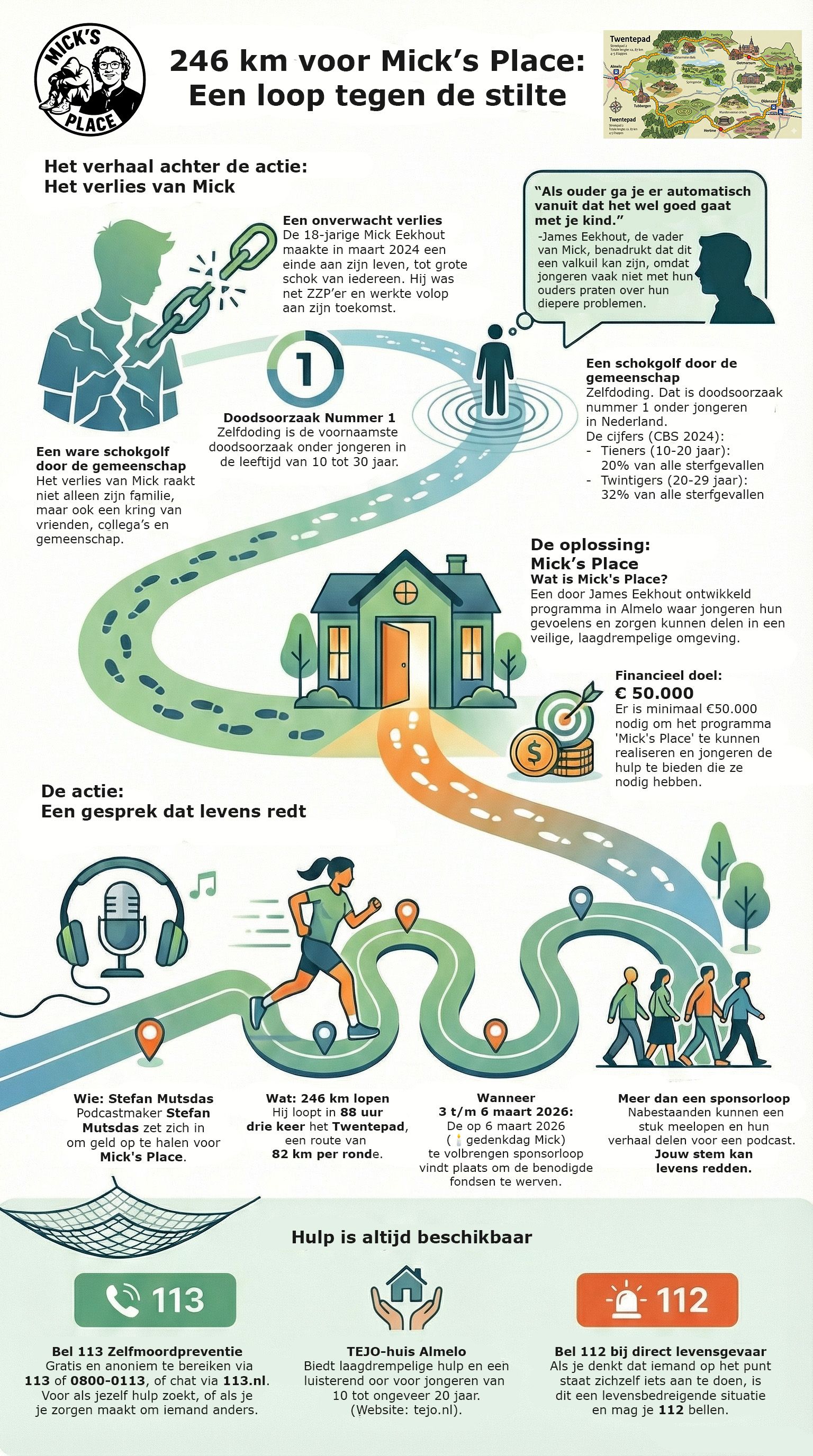 Van 3 tot en met 6 maart 2026 loopt podcastmaker Stefan Mutsdas drie keer het Twentepad (82 km per ronde) om geld op te halen voor dit initiatief. Ouders die een kind verloren aan zelfdoding kunnen een stuk meelopen en hun verhaal delen. Deze gesprekken worden later gebundeld in een podcast.
