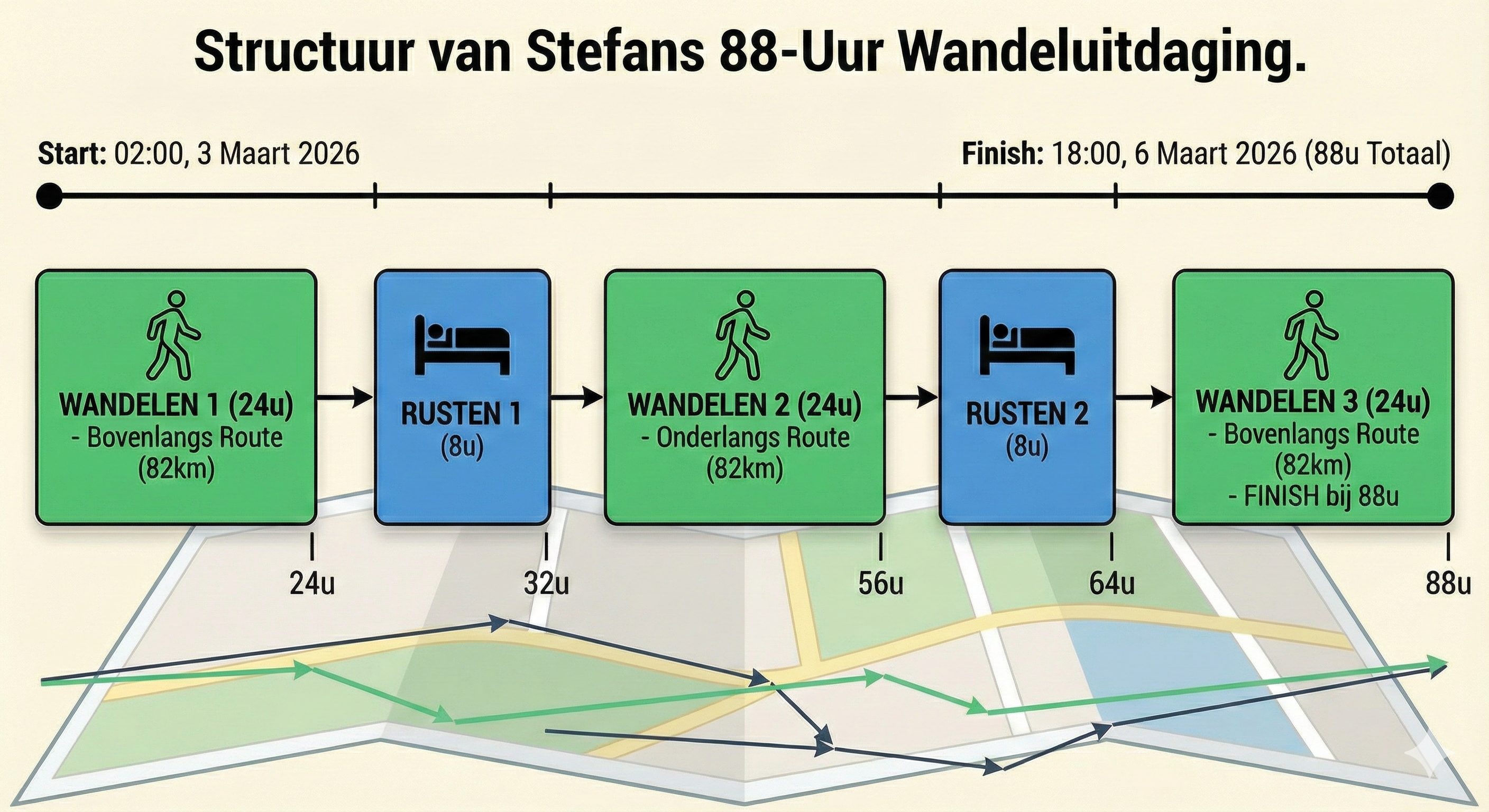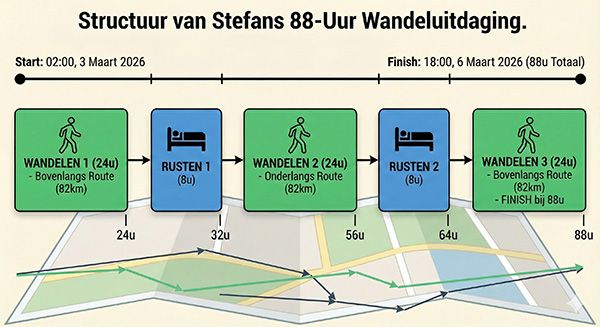 Het streven van Stefan is om telkens 24 uur op (wandelend) en 8 uur af (rustend) te gaan. In die 24 uur op loopt hij het rondje van 82 kilometer. Per dag afwisselend boven- of onderlangs. Binnen 88 uur, dus uiterlijk 6 maart 2026 om 18:00 uur zal zijn wandeluitdaging ten einde zijn gekomen.