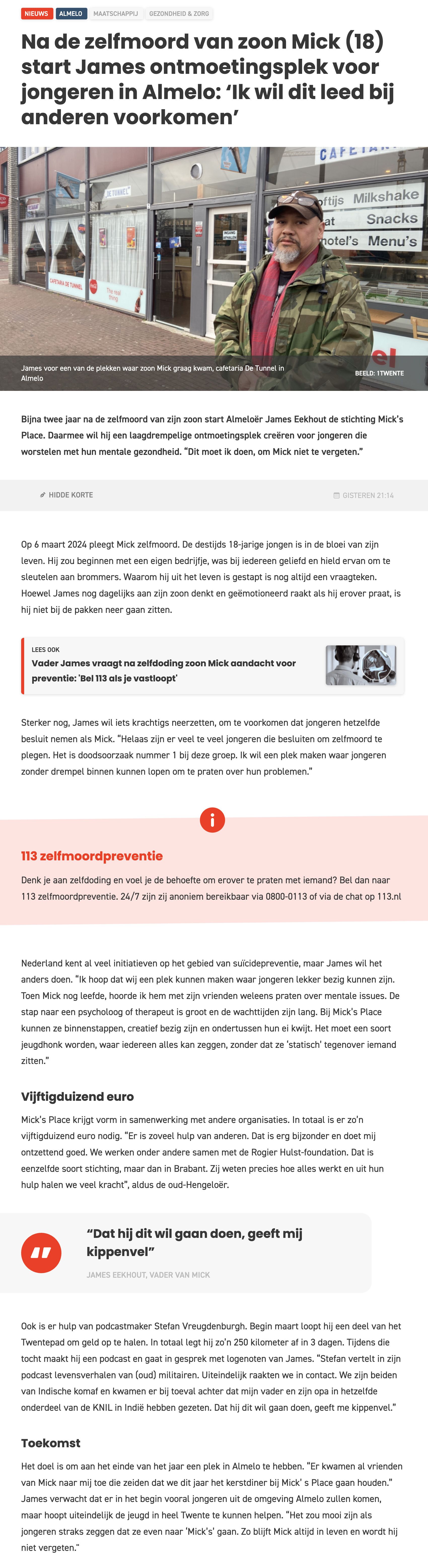 Zijn vader James zet zich sindsdien in voor zelfmoordpreventie onder jongeren. In Almelo ontwikkelt hij 'Mick's Place': een programma waar jongeren hun gevoelens en zorgen kunnen delen. Hiervoor is minimaal €50.000 nodig.